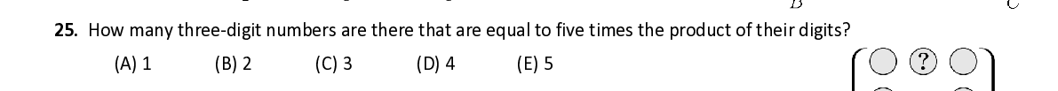 Q25. How many three - digit numbers are there that are equal to five times the product of their digits ?
