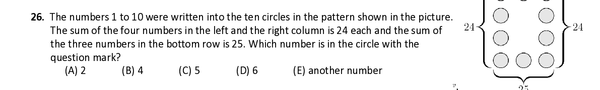 Q26. The numbers 1 to 10 were written into the ten circles in the pattern shown in the picture . The sum of the four numbers in the left and the right column is 24 each and the sum of the three numbers in the bottom row is 25. Which number is in the circle with the question mark ?