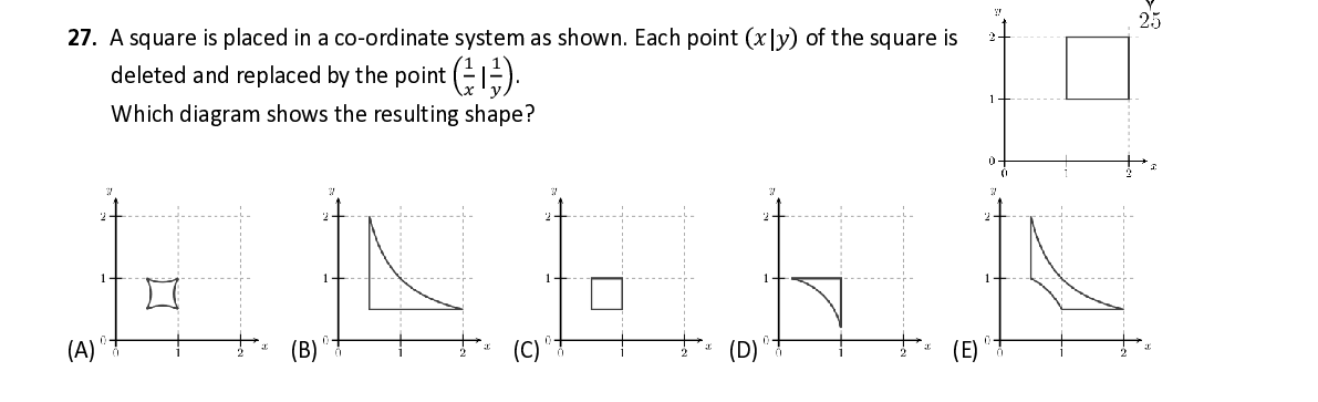 Q27. A square is placed in a co - ordinate system as shown. Each point ( 푥 | 푦 ) of the square is 1 1 deleted and replaced by the point ( | ) . 푥 푦 Which diagram shows the resulting shape ?