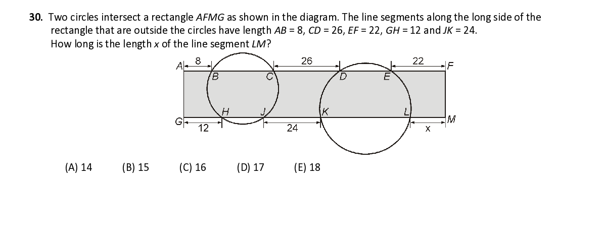 Q30. Two circles intersect a rectangle AFMG as shown in the diagram. The line segments along the long side of the rectangle that are outside the circles have length AB = 8, CD = 26, EF = 22, GH = 12 a nd JK = 24. How long is the length x of the line segment LM ?