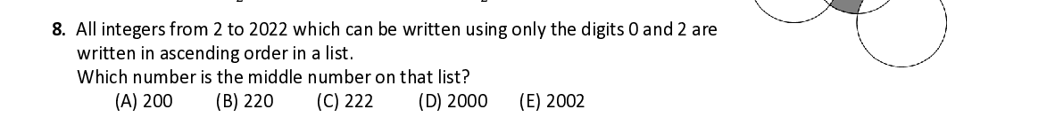 Q8. All integers from 2 to 2022 which can be written using only the digits 0 and 2 are written in ascending order in a list. W hich number is the middle number on that list ?