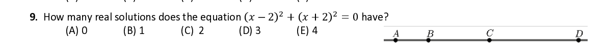 Q9. How many real solutions does the equation ( 푥 − 2 ) + ( 푥 + 2 ) = 0 have ?
