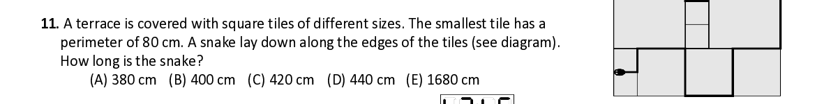 Q11. A terrace is covered with square tiles of different sizes. The smallest tile has a perimeter of 80 cm. A snake lay down along the edges of the tiles (see diagram) . How long is the snake ?
