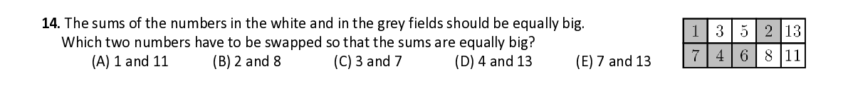Q14. The sum s of the numbers in the white and in the grey fiel d s should be equall y big . Which two numbers have to be swapped so that the sums are equally big ?