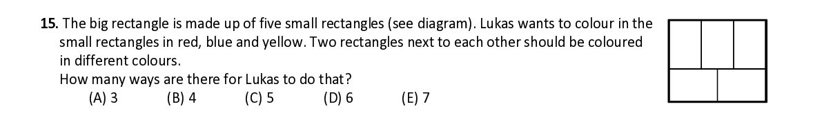 Q15. The big rectangle is made up of five small rectangles (see diagram). Lukas wants to colour in the small rectangles in red, blue and yellow. Two rectangles next to each other should be coloured in different co lours. How many ways are there for Lukas to do that ?