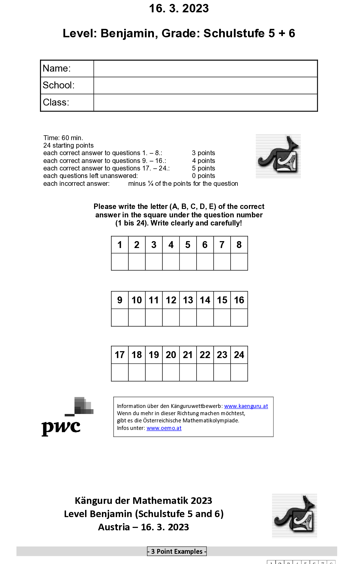 Q19. A rabbit, a beaver and a kangaroo are hav ing a competition. All three begin at the same time from the “ Start ” and hop in the same direction. The beaver always moves one position forwards with each jump. The rabbit always moves two positions forwards with one jump and the kangaroo always three positions . Whoever takes the least am ount of jumps to land exactly in the position labelled „Ziel“ is the winner . W ho wins the competition ?