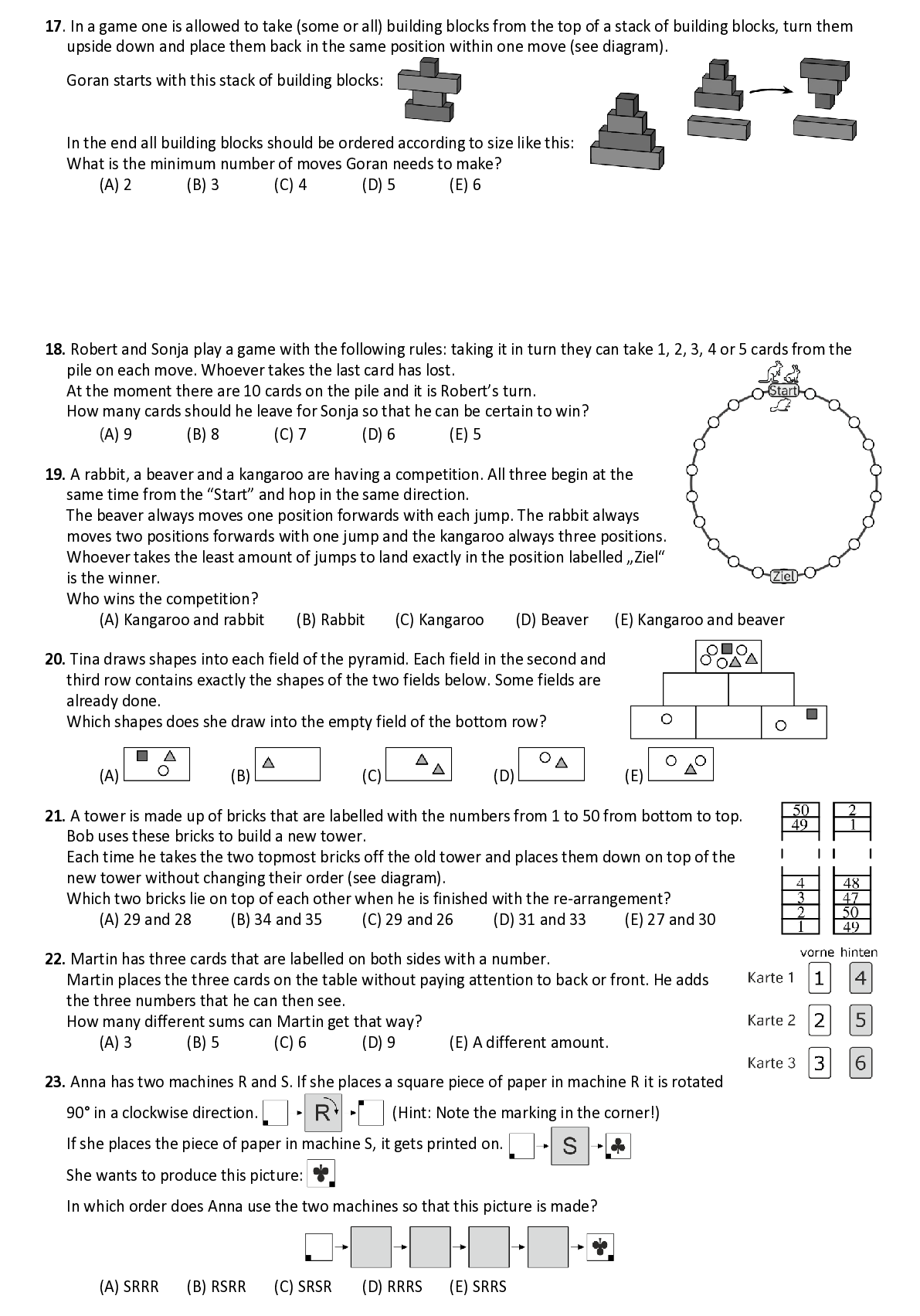 Q17. In a game one is allowed to take (some or all) building blocks from the top of a stack of building blocks , turn them upside down and place them back in the same position within one move (see diagram) . Goran starts with this stack of bui ld ing block s : In the end all building blocks should be ordered according to size like this : What is the minimum number of moves Goran needs to make ?