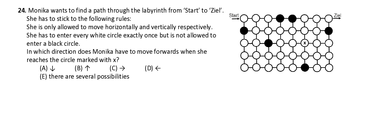 Q24. Monika wants to find a path through the la byrinth from ‘ Start ’ to ‘ Ziel ’ . She has to stick to the following rules : She is only allowed to move horizontally and vertically respectively . S he has to enter every white circle exactly once but is not allowed to enter a black circle . In w hich direction does Monika have to move forward s when she r eaches the ci rcle marked with x ?