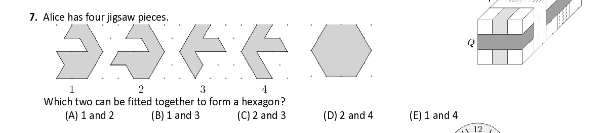 Q7. Alice ha s four jigsaw pieces. W hich two can be fit ted together to form a hexagon ?
