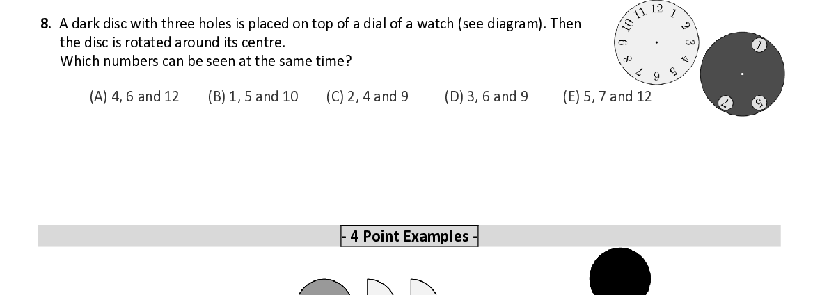 Q8. A dark disc with three holes is placed on top of a dial of a watch (see diagram). Then the disc is rotated around its cent re . Which numbers can be seen at the same time ?