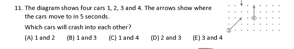Q11. The diagram shows four cars 1, 2, 3 a nd 4. The arrows show where the cars move to in 5 seconds . W hich cars will crash into each other ?