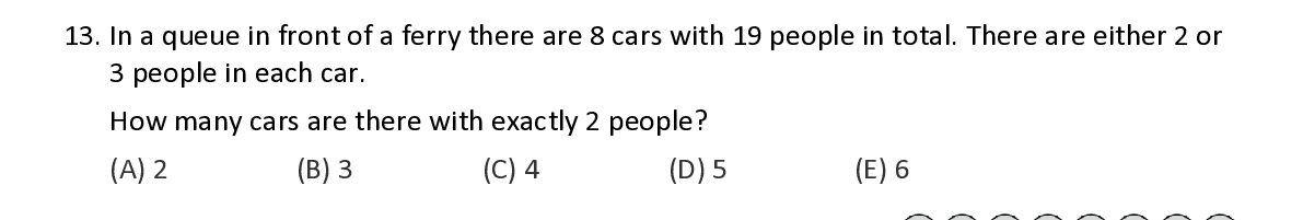 Q13. In a queue in front of a ferry there are 8 cars with 19 people in total. There are either 2 or
