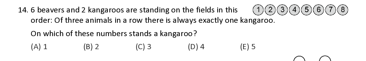Q14. 6 beavers and 2 kangaroos are standing on the fields in this order : Of three animals in a row there is always exactly one kangaroo . On which of these numbers stands a kangaroo ?
