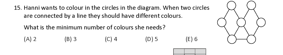 Q15. Hanni wants to colour in the circles in the diagram . When two circles are connected by a line they should have different co lours . What is the minimum number of colours she needs ?