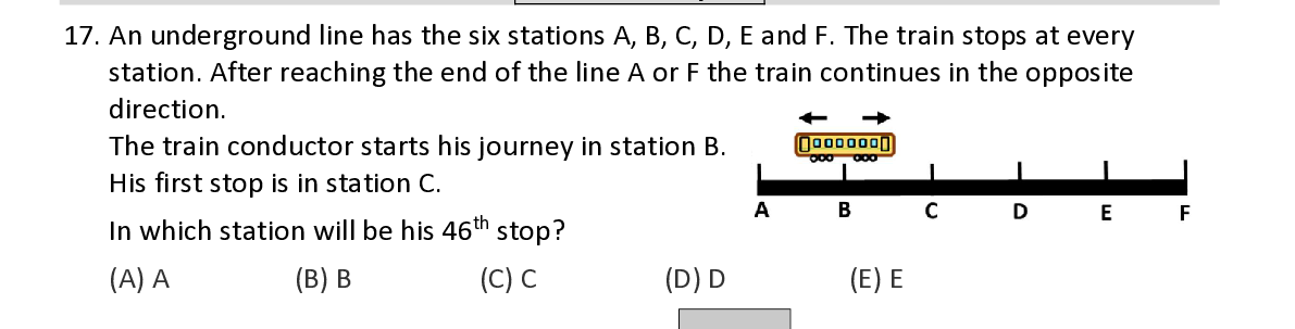 Q17. An underground line has the six stations A, B, C, D, E a nd F. The train stops at every station. After reaching the end of the line A or F the train continues in the opposite direction. The train conductor starts his journey in station B. His first stop is in station C. th In which station will be his 46 st op ?