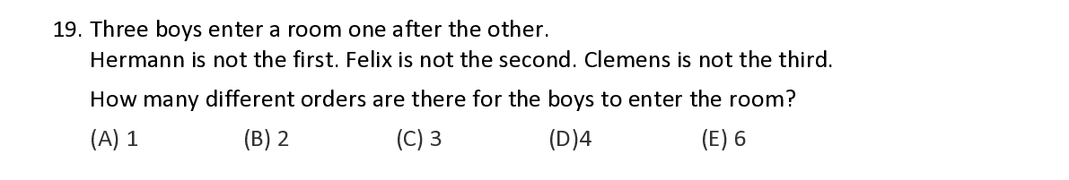 Q19. Three boys enter a room one after the other . Hermann is not the first . Felix is n o t the second . Clemens is n o t the third . How many different orders are there for the boys to enter the room ?