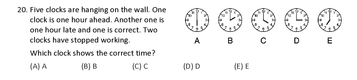 Q20. Five clocks are hanging on the wal l . One clock is one hour ahead. Another one is one hour late and one is correct . Two clocks have stopped working . W hich clock shows the correct time ?