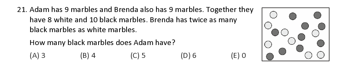 Q21. Adam ha s 9 marbles and Brenda also has 9 marbles . Together they have 8 white and 10 bl ack marbles . Brenda ha s twice as many black marbles as white marbles . How many black marbles does Adam have ?