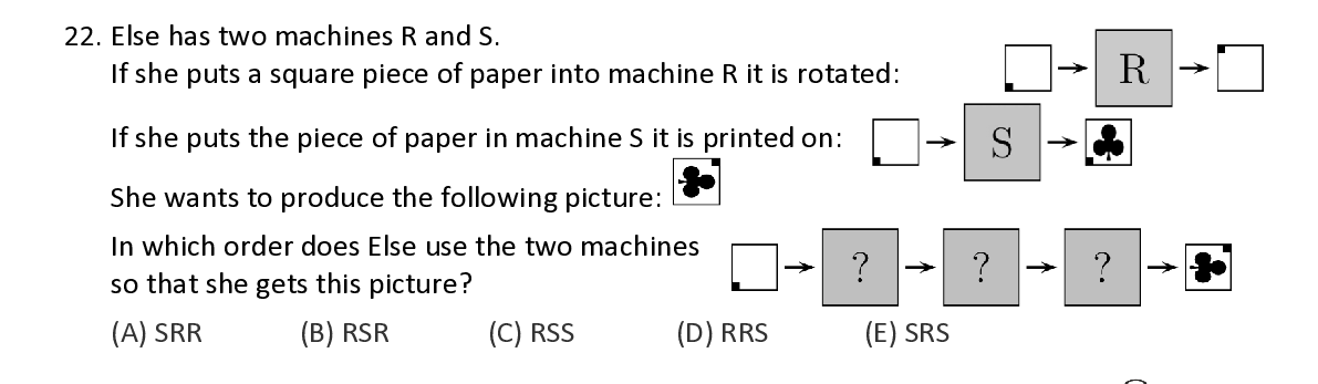 Q22. Else ha s two machines R a nd S. If she puts a square piece of paper into machine R it is rotated : If she puts the piece of paper in machine S it is printed on : She wants to produce the following pict ure : In which order does Else use the two machines so that she gets this pictur e ?