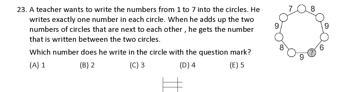 Q23. A teacher wants to write the numbers from 1 to 7 into the circles. He writes exactly one number in each circle . When he adds up the two numbers of circles that are next to each other , he gets the number that is written between the two circles. W hich number does he write in the circle with the question mark ?
