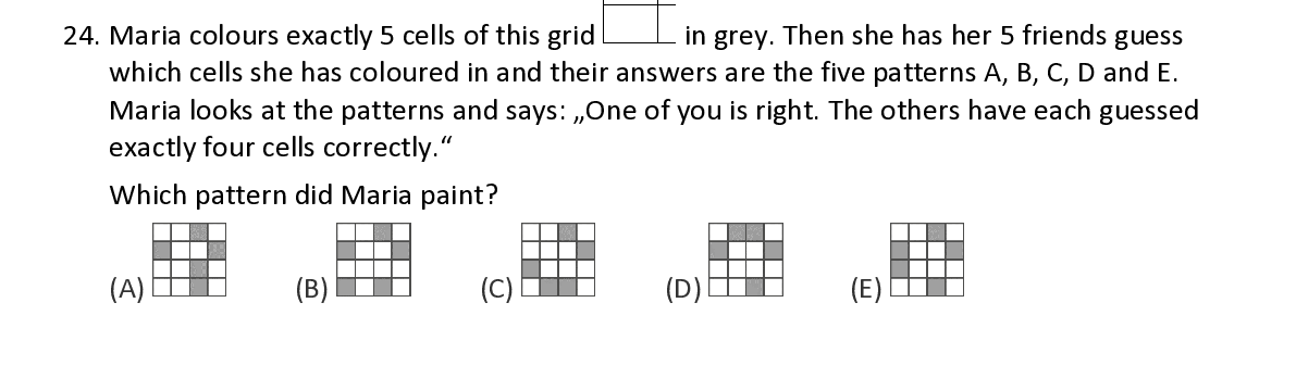 Q24. Maria colours exactly 5 cells of th is grid in grey . Then she has her 5 friends guess which cells she has coloured in and their answers are the five patterns A, B, C, D a nd E. Maria looks at the patterns and says : „ On e of you is right. The others have each guessed exactly four cells correctly .“ W hich pattern did Maria paint ?