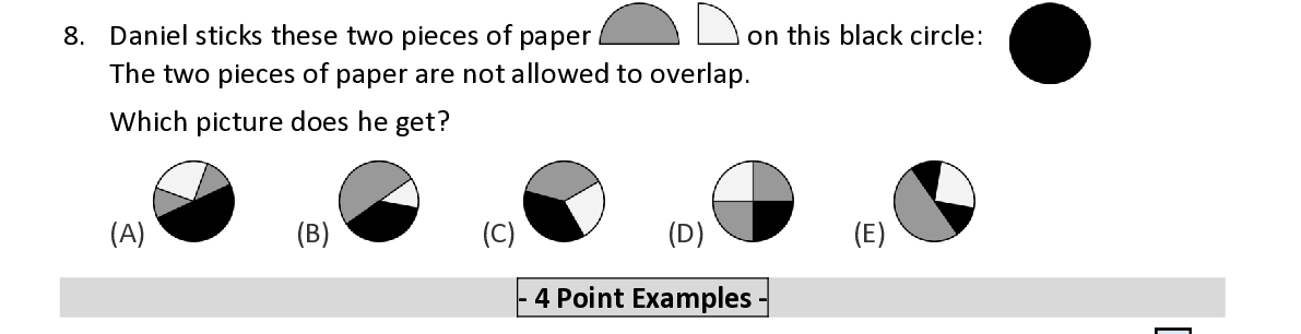 Q8. Daniel sticks these two pieces of paper o n this black circle : The two pieces of paper are not allowed to overlap. W hich picture does he get ?