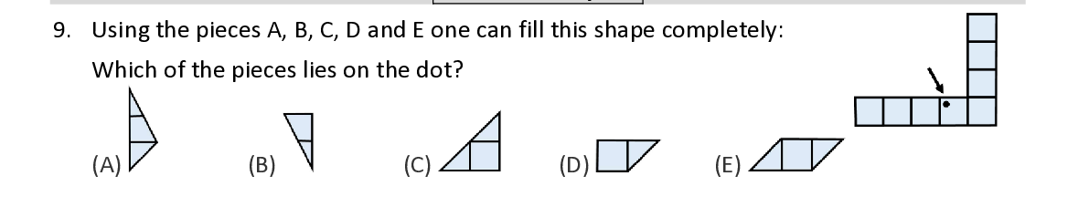 Q9. Using the pieces A, B, C, D a nd E one can fill th is sh ape completely : W hich of the pieces lies on the do t ?
