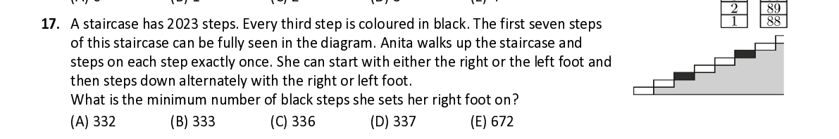 Q17. A staircase has 2023 steps . Every third step is coloured in black . The first seven steps of this staircase can be fully seen in the diagram. Anita walks up the staircase and steps on each step exactly once. She can start with either the right or the left foot and then steps down alternately with the right or left fo ot. What is the minimum number of black steps she sets her right foot on ?