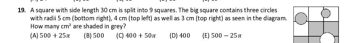 Q19. A square with side length 30 cm is split i nto 9 squares . The big square contains three circles with radii 5 cm ( b ottom right ), 4 cm ( top left ) as well as 3 cm ( top right ) as seen in the diagram . How many cm² are shaded in grey ?