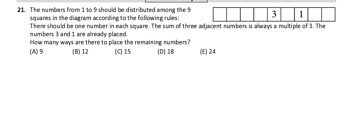 Q21. The numbers from 1 to 9 should be distributed among the 9 squares in the diagram according to the following rules: There should be one number in each square. The sum of three adjacent numbers is always a multiple of 3 . The numbers 3 and 1 are already placed. How many ways are there to place the remaining numbers ?