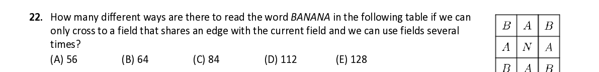 Q22. How many different ways are there to read the word BANANA in the following table if we can only c ross to a field that shares an edge with the current field and we can use fields several times ?