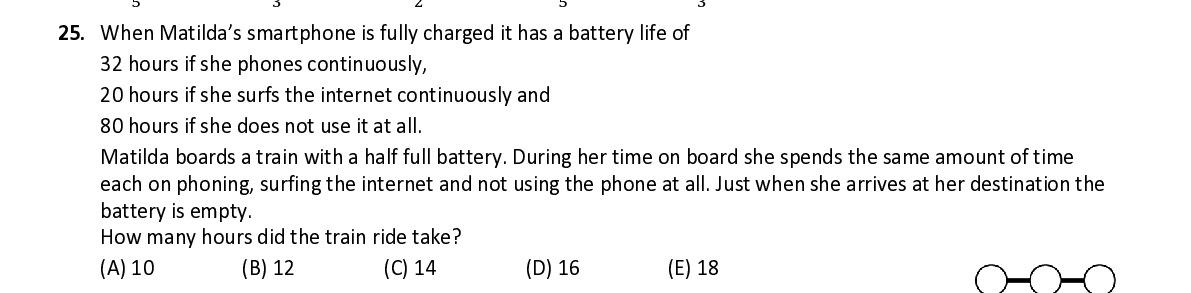 Q20. hours if she surfs the internet continuously and 80 hours if she does not use it at all . Matilda boards a train with a half full battery . During her time on board she spend s the same amount of time each on phon ing, surfing the internet and not using the phone at all. Just when she arrives at her destination the battery is empty . How many hours did the train ride take ?
