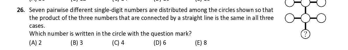 Q26. Seven pairwise different single - digit numbers are distributed among the circles shown so that the product of the three numbers that are connected by a straight line is the same in all three case s . Which number is written in the circle with the question mark ?