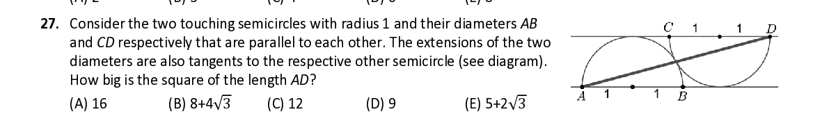 Q27. Consider the two touching semicircles with radius 1 and their diameters AB and CD respectively that are parallel to each other. The extension s of the two diameters are also tangents to the respective other semicircle (see diagram) . How big is the square of the length AD ?