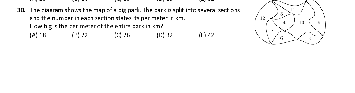 Q30. The diag ram shows the map of a big park. The park is split into several sections and the number in each section states its perimeter in km. How big is the perimeter of the entire park in km?