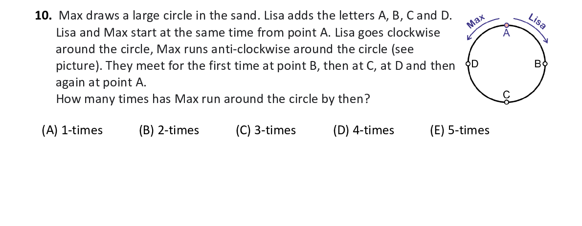 Q10. Max draws a large circle in the sand. Lisa adds th e letters A, B, C and D. Lisa and Max start at the same time from point A. L isa goes clockwise around the circle, Max runs anti-clockwise around t he circle (see picture). They meet for the first time at point B, then at C, at D and then again at point A. How many times has Max run around the circle by the n?