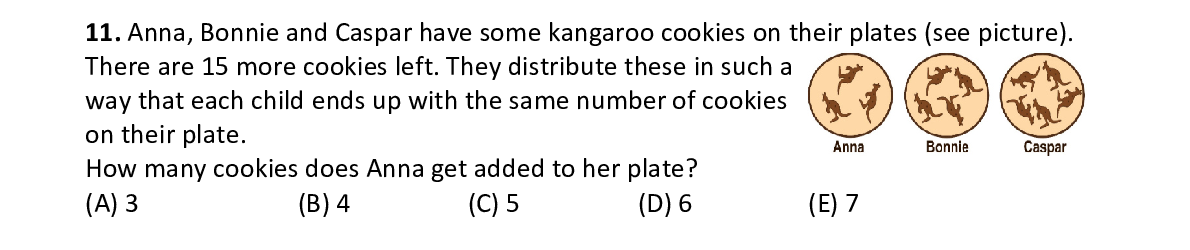 Q11. Anna, Bonnie and Caspar have some kangaroo cookies on their plates (see picture). There are 15 more cookies left. They distribute the se in such a way that each child ends up with the same number of cookies on their plate. How many cookies does Anna get added to her plate?