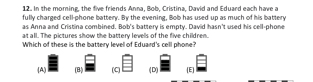 Q12. In the morning, the five friends Anna, Bob, Cristi na, David and Eduard each have a fully charged cell-phone battery. By the evening, B ob has used up as much of his battery as Anna and Cristina combined. Bob's battery is emp ty. David hasn't used his cell-phone at all. The pictures show the battery levels of the five children. Which of these is the battery level of Eduard's cel l phone?