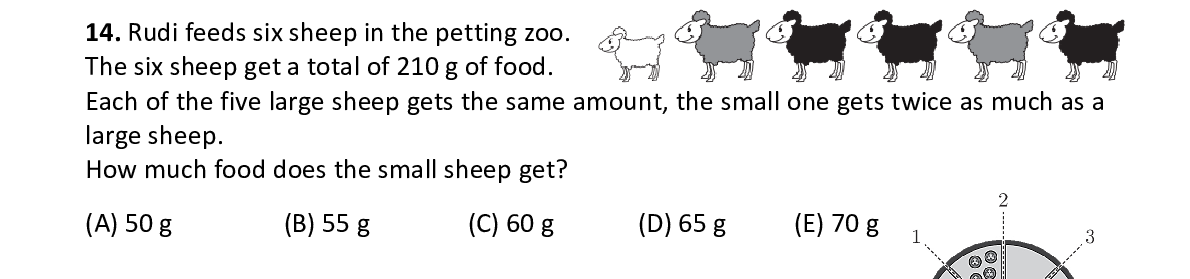 Q14. Rudi feeds six sheep in the petting zoo. The six sheep get a total of 210 g of food. Each of the five large sheep gets the same amount, the small one gets twice as much as a large sheep. How much food does the small sheep get?