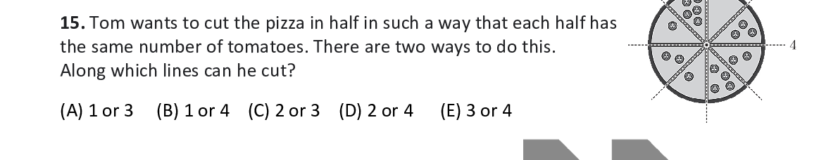 Q15. Tom wants to cut the pizza in half in such a way t hat each half has the same number of tomatoes. There are two ways to do this. Along which lines can he cut?