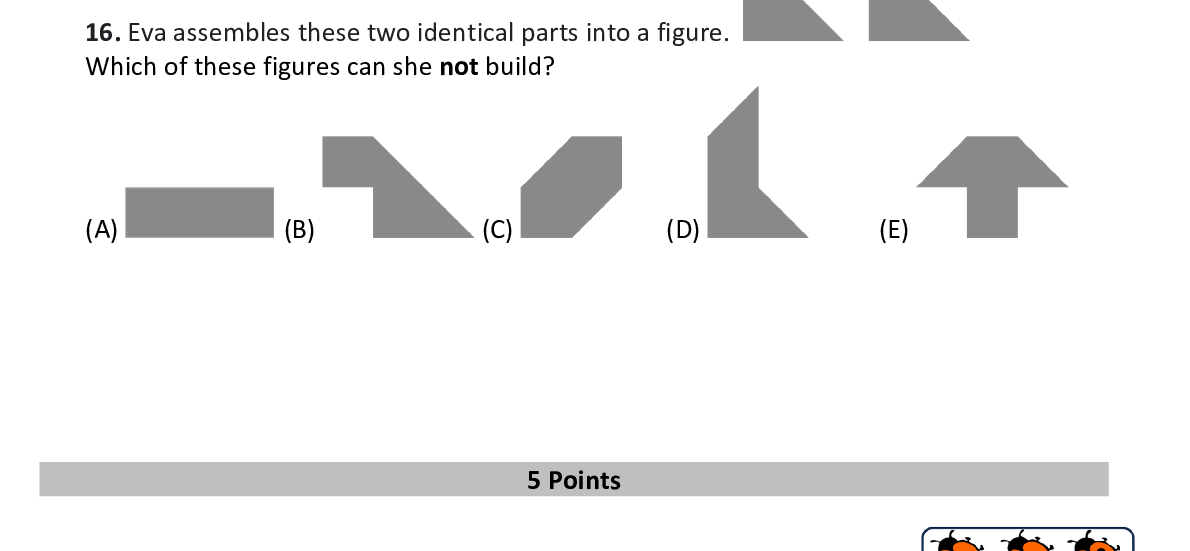 Q16. Eva assembles these two identical parts into a fig ure. Which of these figures can she not build?