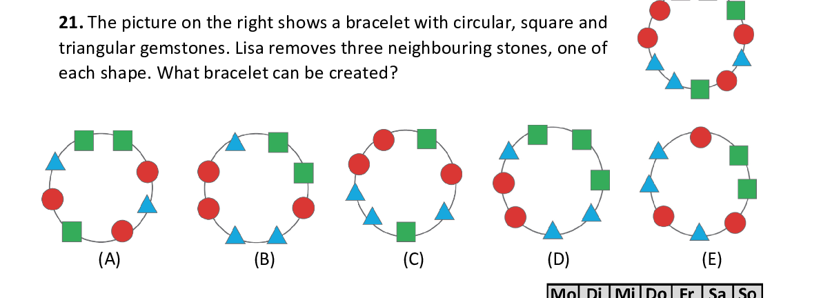 Q21. The picture on the right shows a bracelet with cir cular, square and triangular gemstones. Lisa removes three neighbouri ng stones, one of each shape. What bracelet can be created?