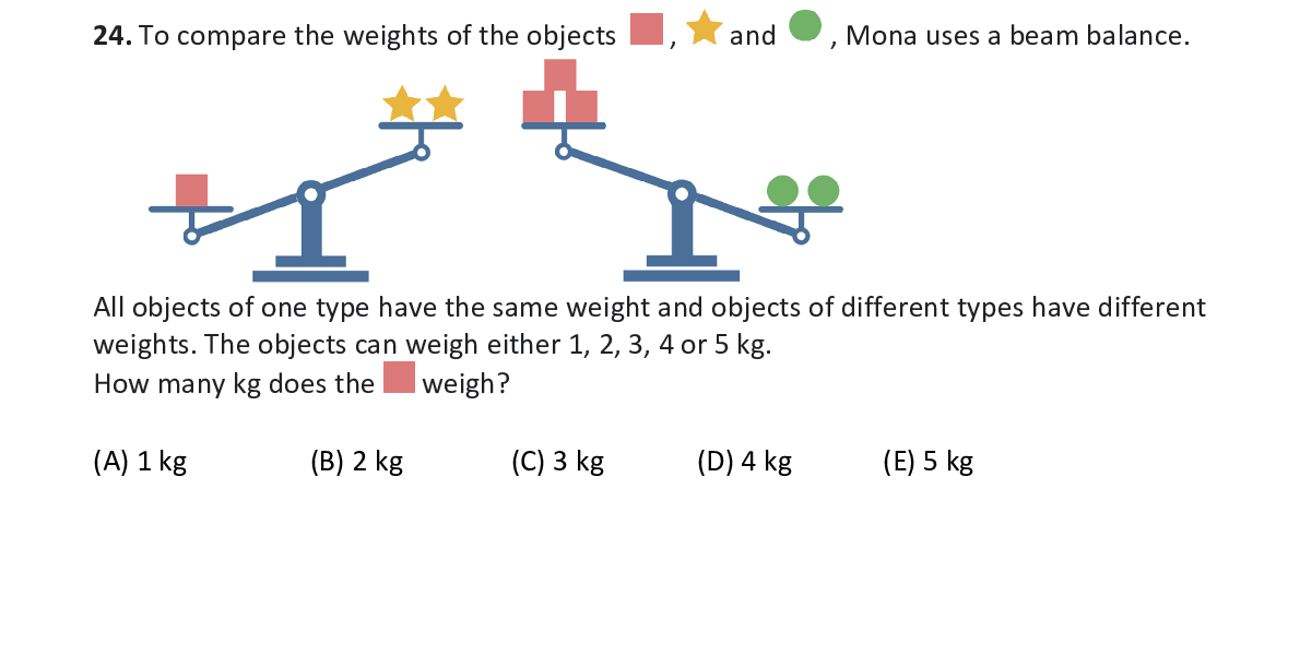 Q24. To compare the weights of the objects , and , M ona uses a beam balance. All objects of one type have the same weight and ob jects of different types have different weights. The objects can weigh either 1, 2, 3, 4 or 5 kg. How many kg does the weigh?