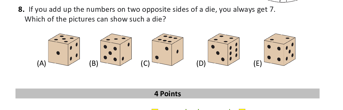 Q8. If you add up the numbers on two opposite sides of a die, you always get 7. Which of the pictures can show such a die?