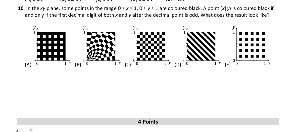 Q10. In the xy plane, some points in the range 0 x 1, 0 y 1 are coloured black. A point ( x | y ) is coloured black if and only if the first decimal digit of both x and y after the decimal point is odd. What does the resu lt look like?