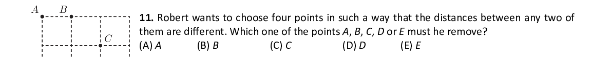 Q11. Robert wants to choose four points in such a way th at the distances between any two of them are different. Which one of the points A , B , C , D or E must he remove?