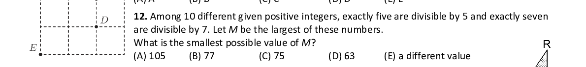 Q12. Among 10 different given positive integers, exactl y five are divisible by 5 and exactly seven are divisible by 7. Let M be the largest of these numbers. What is the smallest possible value of M ?