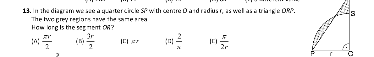 Q13. In the diagram we see a quarter circle SP with centre O and radius r, as well as a triangle ORP . The two grey regions have the same area. How long is the segment OR ? r 3 r 2