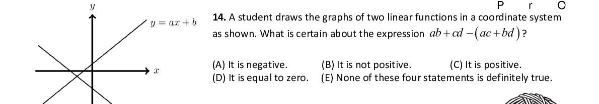 Q14. A student draws the graphs of two linear functions in a coordinate system as shown. What is certain about the expression ab cd ac bd ?