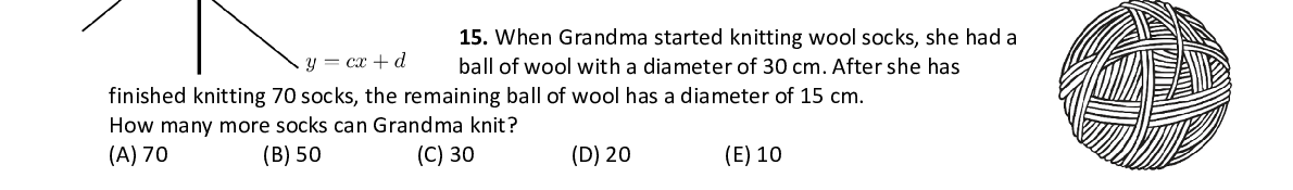 Q15. When Grandma started knitting wool socks, she had a ball of wool with a diameter of 30 cm. After she ha s finished knitting 70 socks, the remaining ball of w ool has a diameter of 15 cm. How many more socks can Grandma knit?